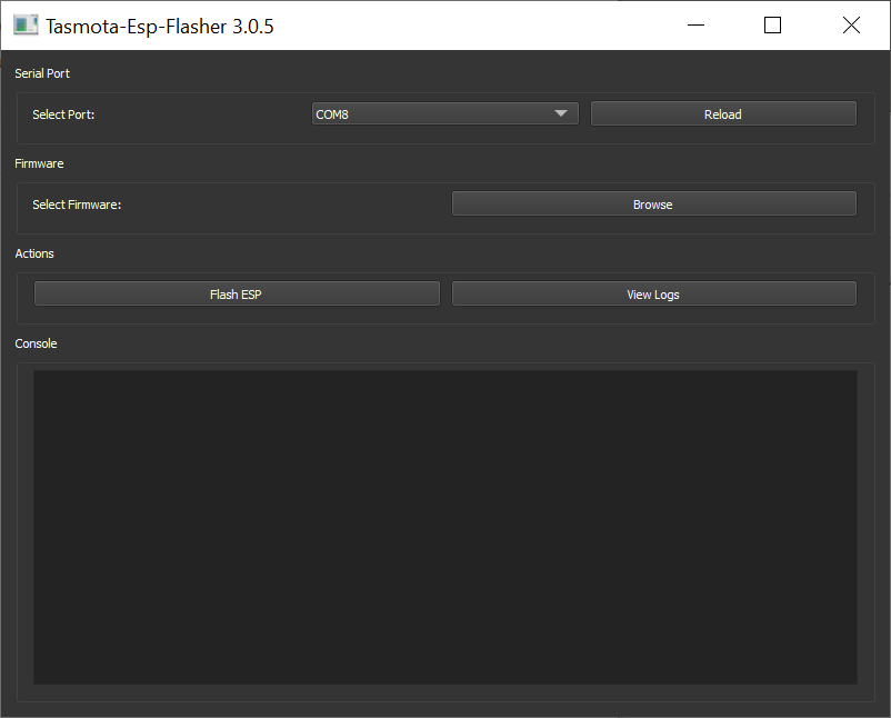 To upgrade the firmware, you need to download the ESP-Flasher tool to your Windows PC (alternatively directly from Github), and the new firmware file. Connect the device to the USB port of your computer and start the flash tool. Select the COM port of the device and browse for the new firmware file on your PC. Click the flash ESP button to upload the new firmware.