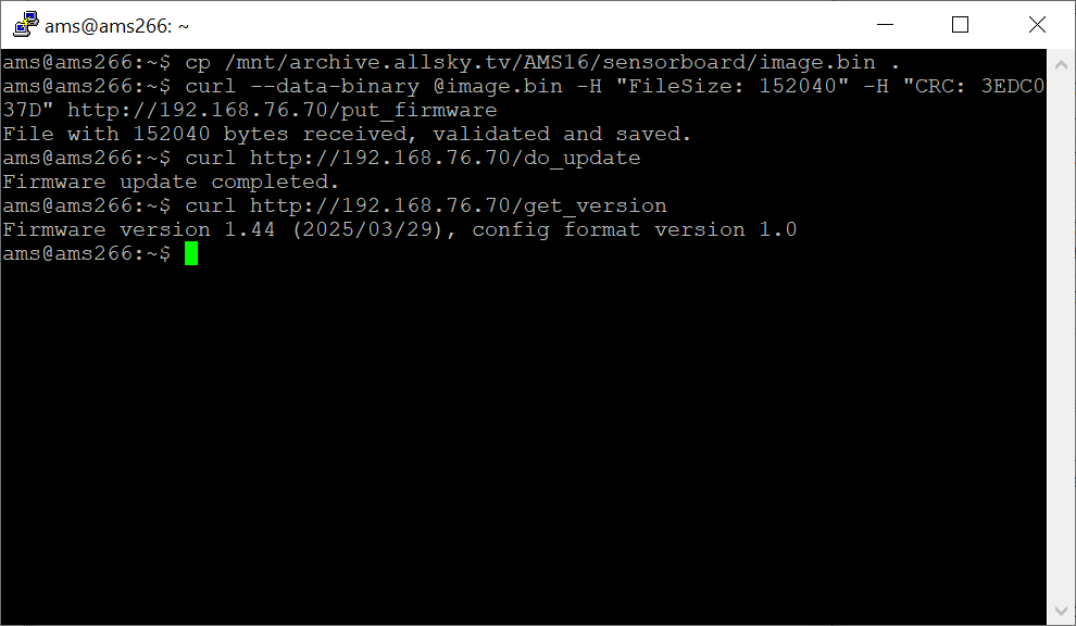 To upgrade the firmware, upload the new firmware file together with the file size and CRC32 fingerprint to the device with the corresponding HTTP command.
